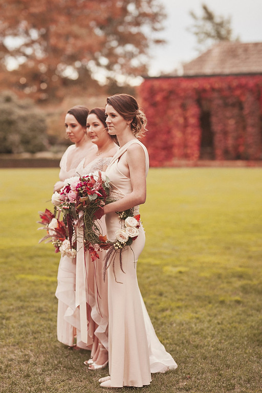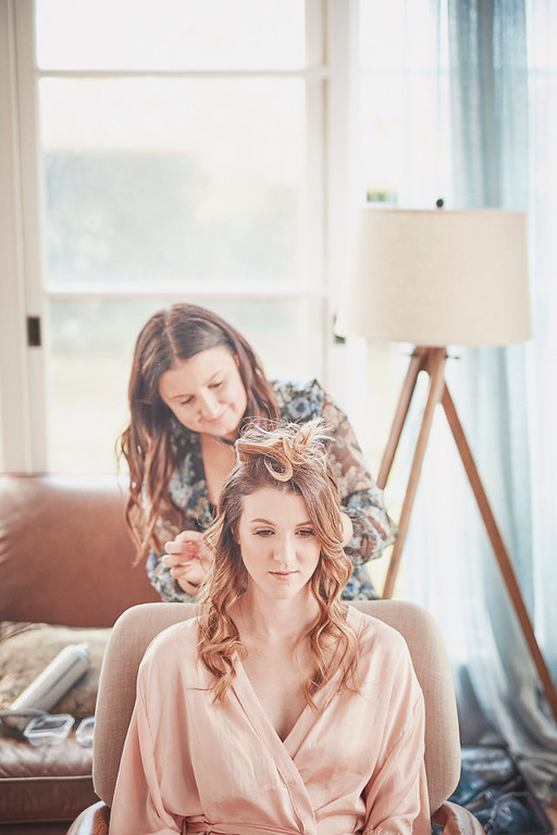 For the bridesmaids, soft curls were turned into low textured buns, with the hair pulled off the faces of these beautiful girls. The buns were then surmounted with a single, simple flower to finish the look and tie into their beautiful and unique bouquets.